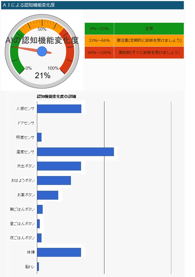 これらの情報を集め、解析し、過去とのデータと比較を行うことで、認知機能低下の早期の気づきの判定要因とします。