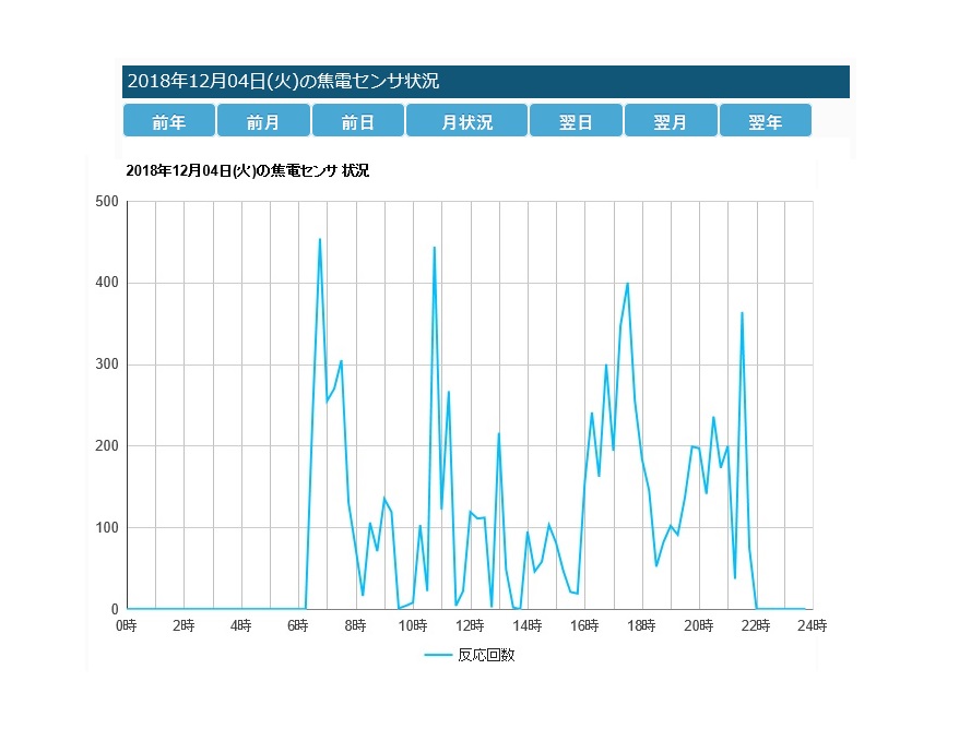 パッシブデータとして、本体に搭載された人感センサによる、利用者様の活動量を計測します。一日の生活時間の中での反応時間を測定することで利用者様の活動量と、引きこもり度合いを数値化することができます。