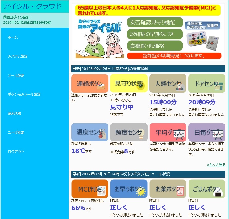 クラウドアクセスはWebブラウザでアクセスします。 個人の認証は、ユーザIDとパスワードで管理されます。 クラウドログイン後の画面では現在の状況が一目で判るデザインになっています。