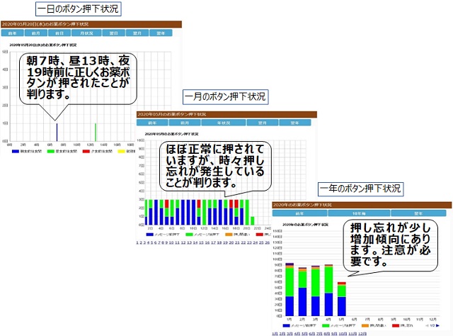 離れて暮らす家族や介護者は、ボタンの押し忘れ等の状況を確認することで注意を促すことができます。。